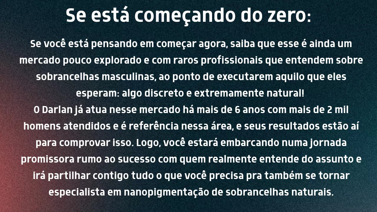 Seu nome é Darlan Fernandes, e trabalha há mais de 6 anos com nanopigmentação de sobrancelhas naturais, oferecendo aos seus clientes os resultados mais discretos e naturais do Brasil. Depois de tantos atendimentos foi possível afirmar com certeza que ele tem o entendimento e experiência necessários para realização desses trabalhos com maestria, pois sabe bem o que os homens e mulheres procuram quando pensam em fazer algum procedimento estético, seus medos e expectativas.